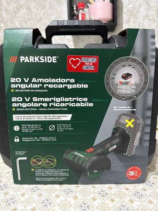 Amoladora angular recargable Parkside de 20V. - Modelo: PWSAM 20-LI C2. - Sin batería ni cargador. - Velocidad de giro en vacío: 19.500 rpm. - Diámetro de discos de corte: 76 mm. - Alojamiento: M6 - SPINDLE LOCK. - Batería recomendada: 20 V (2 Ah).