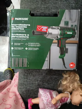 Atornilladora de impacto eléctrica Parkside, modelo PDSE 550 A1. - Potencia nominal: 550 W. - Velocidad de giro en vacío: 3700 rpm. - Par de apriete máx.: 100 Nm. - Par de aflojamiento máx.: 500 Nm. - Portaherramientas: cuadrado exterior de 1/2. - Incluye accesorios.