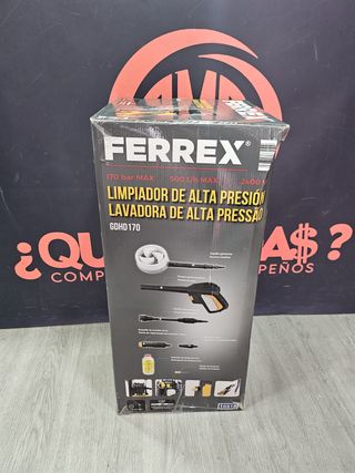 Limpiadora de alta presión Ferrex GDHD170, con 2400W de potencia. Somos tienda fisica, damos 2 años de garantia. - Presión máxima de 170 bar. - Caudal máximo de 500 L/h. - Manguera de alta presión de 10m con enrollador integrado. - Pistola pulverizadora con gatillo de seguridad y lanza. - Función de iluminación rápida para soporte de cable. - Asa telescópica con altura regulable. - Ruedas para facilitar el transporte. - Cable de alimentación de 5m. - Manguera pulverizadora con manómetro integrado.