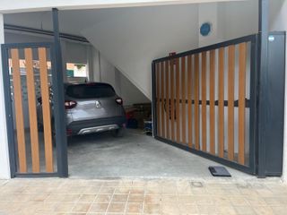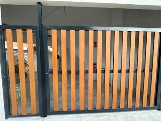 Se vende puerta batiente de diseño moderno y elegante, perfecta para garajes, viviendas unifamiliares o comunidades de vecinos. Incluye sistema de motorización y mandos incluídos. 2 años de uso. Fabricada con estructura metálica robusta lacada en gris antracita, combinada con lamas verticales decorativas efecto madera, que aportan un acabado actual y de alta calidad, integrándose perfectamente en entornos modernos. 🔧 Características principales: -Ancho total: 2.70m + 85 cm de paso peatonal -Altura aproximada: 1,90m -Estructura metálica resistente (acero o aluminio) -Lamas verticales imitación madera, resistentes a la intemperie.