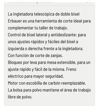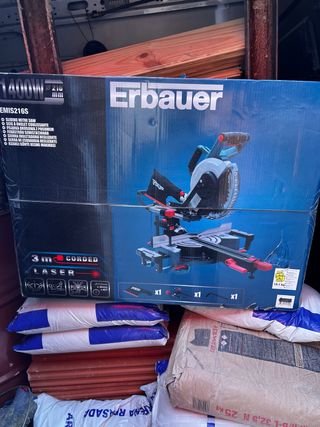 Ingletadora Erbauer de 1400W con disco de 216mm y láser. - Modelo: EMIS216S - Potencia: 1400W - Diámetro del disco: 216mm - Incluye láser para cortes precisos - Tipo: Sierra de inglete deslizante - Alimentación: Cableada (corded) - Longitud del cable: 3m