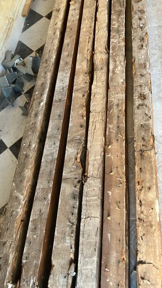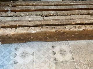 Conjunto de vigas de madera con un acabado rústico, ideales para proyectos de construcción o decoración. Precio por unidad. - 3 vigas de medidas: 420 cm largo x 10 cm ancho x 23 cm profundo - 3 vigas de medidas: 235 cm largo x 10 cm ancho x 23 cm profundo - Madera maciza. - Aspecto envejecido y natural. - Presentan marcas y nudos propios de la madera. No se aceptan envíos por volumen y peso.