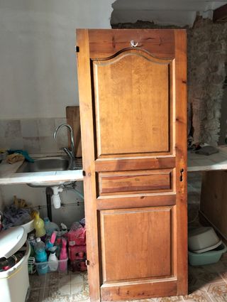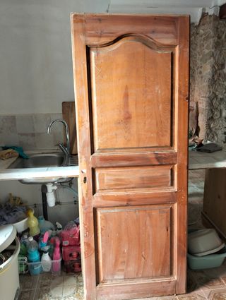 Preciosa puerta de madera maciza, ideal para restaurar. Es una pieza única con un encanto rústico. - Madera de tono cálido y oscuro. - Diseño clásico con paneles. - Ideal para proyectos de decoración o restauración.