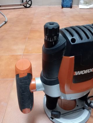 Fresadora de la marca Worx. Ideal para trabajos de carpintería y bricolaje. - Diseño ergonómico con asas de agarre. - Ajuste de profundidad. - Base de aluminio.