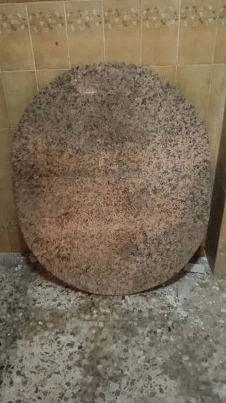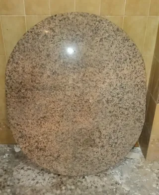 Pieza de mármol con un diseño veteado y moteado. Su forma es circular y su superficie presenta una textura granular. Si forma no llega a ser circular, es ligeramente alargada.