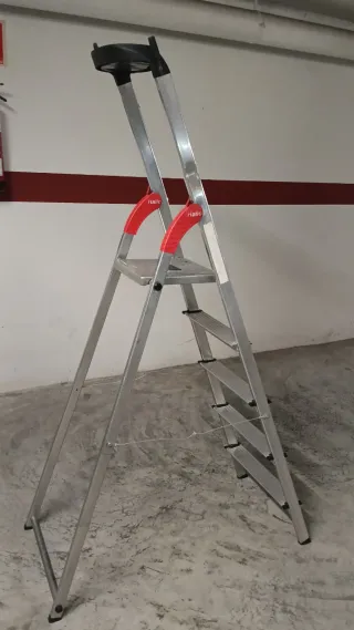 Escalera plegable de la marca Hailo, fabricada en aluminio. - Diseño robusto y ligero. - Asas de sujeción rojas. - Plataforma superior. - 5 peldaños