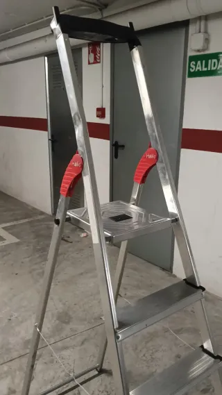 Escalera de almacén con estructura metálica y peldaños antideslizantes. - Pasamanos de seguridad en color rojo. - Diseño robusto para uso en almacenes o exteriores. Altrex Profesional Taurus Time 9 Mide hasta 2,12m Lleva dos ruedas. PRECIO LIGERAMENTE NEGOCIABLE
