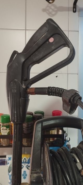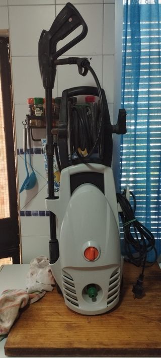 Hidrolimpiadora a presión de color blanco y gris. - Incluye manguera enrollada. - Mango ergonómico. - Ruedas para facilitar el transporte.