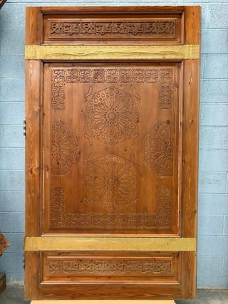 Puerta de madera con un diseño inspirado en el estilo árabe de la Alhambra. Fabricada a mano por los mejores artesanos de Marrakech, tallada a mano con minuciosidad y con el lujo característico del arte Andalusí. Sus dimensiones 245,50cm altura 146cm largo 65mm grosor - Detalles tallados con motivos geométricos. - Banda decorativa metálica dorada en la parte superior e inferior. - Mismo tallado a doble cara ✅ Realizado en madera de pino y acabados de primera calidad. Disponemos 2 unidades únicas en stock. Artículo NUEVO de tienda.