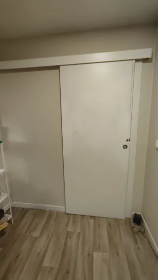Puerta corredera con acabado en madera clara y marco metálico. 2,31cm alto x 76cm ancho. - Diseño moderno y funcional. - Ideal para optimizar espacios. Para armario o para separar habitaciones. Puerta con rodamientos y barra 20€ puerta sola 15€.