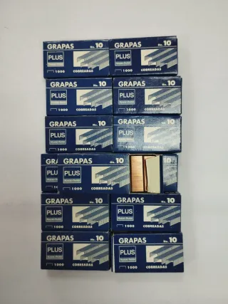 13 cajas de grapas Plus número 10, cobreadas y listas para usar. - Contiene 1000 grapas. - Modelo: Plus No. 10. - Acabado cobreado.