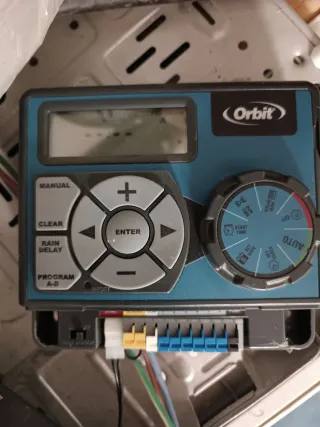 Programador de riego Orbit con pantalla digital y dial giratorio para ajustes. - Botones de control: Manual, Clear, Rain Delay, Program A-B. - Dial con opciones: Auto, Set Clock, Set Date, Start Time, Run Time, Run Often, Off. - Conexiones para sensor de lluvia y cableado.