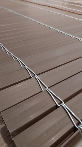 Persiana alicantina enrollada, fabricada en PVC de color marrón. - Material: PVC. - Color: Marrón. - Estructura: Listones unidos con alambre y atada con cuerda. -Medidas: 144x150cm