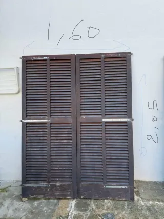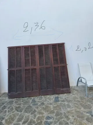 Persiana mallorquina de madera, ideal para exteriores o interiores. Su diseño permite regular la entrada de luz y ventilación. - Fabricada en madera. - Diseño de lamas horizontales. - mallorquinas dobles de 144x212 - puerta de 79 x 212 cm todo el pack 150 euros