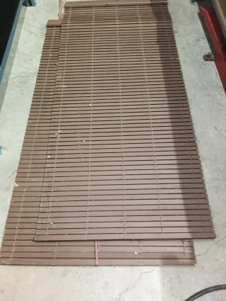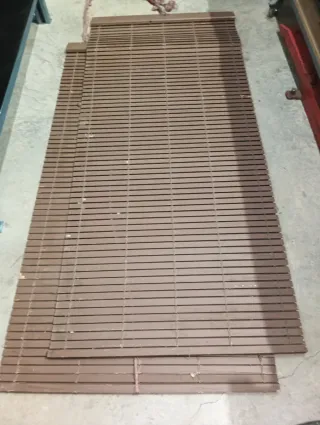 Conjunto de cuatro persianas con acabado en madera. - Color: Madera. - Cantidad: 4 unidades. 2 Persianas de 1,18x1,42 1 Persiana de 1,47x1,76 1 Persiana de 1,28x2,40 15€ la unidad