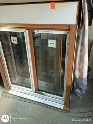 Ventana de PVC con acabado en roble dorado. Ideal para dar un toque cálido a tu hogar. Medidas: 2x 140x100, 2x 140x140, 2x 140x160, 1x 100x140, con vierteaguas Cajón interior con persiana a manivela, más fiable. Cristal doble 4x22x4 - Marco de PVC con acabado imitación madera. - Doble acristalamiento para un mejor aislamiento. El precio de compra fueron 4200€ (ver en la factura subida en el anuncio)