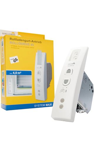 Motor eléctrico para persianas de la marca Schellenberg, modelo Rollodrive 45. Enrollador de banda eléctrico: fácil montaje empotrado (cabe en muchas cajas de pared comunes), ideal para inquilinos para persianas enrollables hasta un área máxima de 4,0 m² (plástico, peso 3,0 kg/m² como valor subyacente) para correas anchas con 23 mm (sistema: maxi) Distancia entre orificios de montaje: 135 mm o 165 mm incluye temporizador automático y detección automática de obstáculos - Para persianas de 21 a 23 mm de ancho de cinta. - Con automatismo horario. - Capacidad máxima de 4,0 m².
