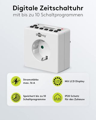 Goobay 93256 - Enchufe digital con temporizador para interiores Digital temporizador control precisamente para aparatos electrónicos con un diseño discreto. Ideal para recurrentes deberes, como por ejemplo persianas, acuarios y carteles de publicidad etc. 10 programas de cambio en 1 minutos pasos, 16 distintos combinaciones de los días de semana, 12- o 24-visualización de hora. Enchufe con seguro para niños Funcionamiento continuo posible – incl. Back-up acumulador para aproximadamente 4 días, con batería de memoria para preservar la programación en caso de interrupción accidental del fluido eléctrico.