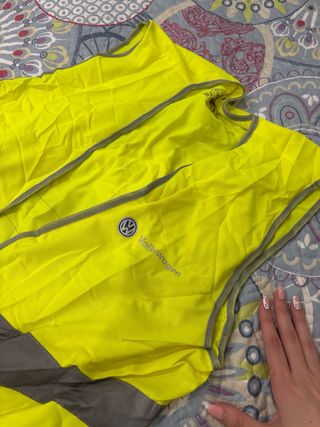 Chaleco reflectante de color amarillo brillante con el logo de Volkswagen. - Logo de Volkswagen plateado. - Cierre de cordón.