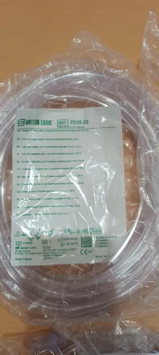 Se venden tubos de oxígeno estériles, listos para su uso. Nuevos a estrenar. - x3 tubos de oxígeno con dos conectores estándar 7.6m - x6 gafas nasal, vástago recto, auricular 1.8m - Empaquetados individualmente. - Material transparente y flexible.