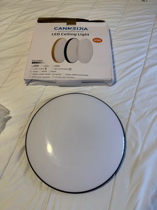 Plafón LED CANMEIJIA de 40W, ideal para iluminar cualquier estancia. Es un producto nuevo, sin estrenar. La parte de la lámpara es blanca y el borde negro. - Potencia: 40W - Control 2.4G - Dimmable - Temperatura de color: 3000K (luz cálida) - Voltaje: AC85-265V 50/60Hz - Diámetro: 37 centímetros La instalación es facilísima, no requiere transformadores ni nada. Conectar y a funcionar.
