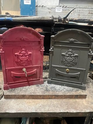 Dos buzones de aluminio con un diseño clásico y elegante. - Buzón rojo con detalles en relieve. - Buzón gris oscuro con detalles en relieve. - Cada buzón tiene una ranura para correo y un compartimento inferior con cerradura.