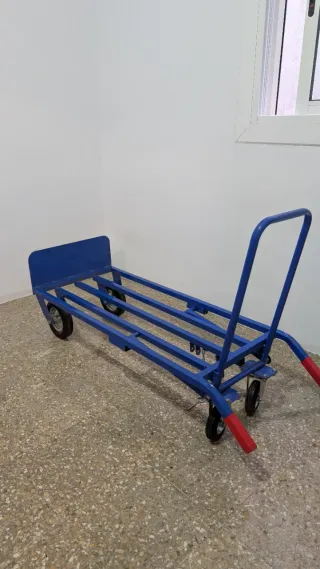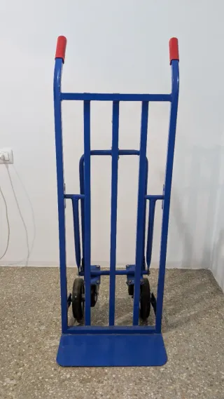 Carretilla de carga resistente y práctica, ideal para mover objetos pesados. Muy robusto, utilizable en posición vertical o en modo carro. Estructura de metal grueso. Ruedas también muy resistentes. - Estructura metálica de color azul. - Ruedas para facilitar el transporte. - Empuñaduras rojas para un mejor agarre. - Marca francesa SETON