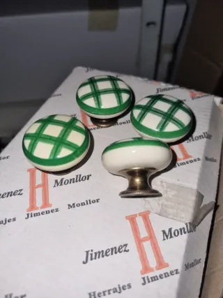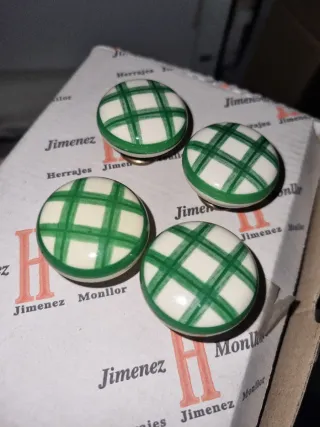 Conjunto de cuatro pomos con diseño de cuadros verdes estilo vichy. - Diseño de cuadros verdes. - Base blanca. - Acabado brillante. Comoletamente nuevos Fabricación Española Herrajes Jimenez Monllor