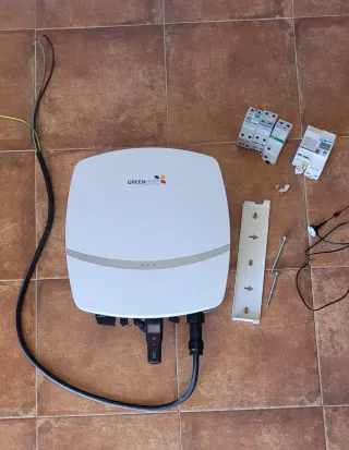 Inversor de red GreenHeiss. Incluye: Soporte Cable wifi Protecciones Medidor Toma de corriente - Color blanco. - Diseño moderno.