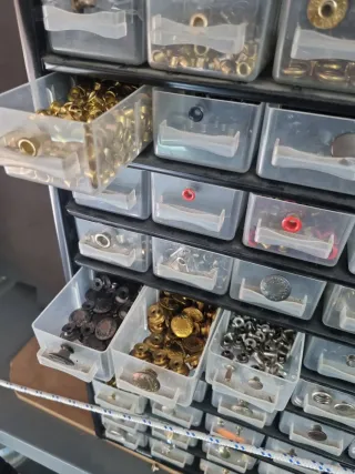 Práctico organizador con varios compartimentos para guardar ojetes y remaches. - Incluye una gran variedad de ojetes y remaches. - Múltiples cajones transparentes para fácil visualización. - Estructura negra resistente.