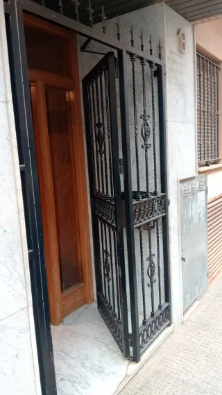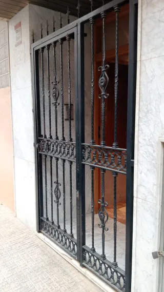 Elegante cancela de hierro forjado con un diseño ornamental. - Fabricadas en hierro resistente. - Detalle de volutas y motivos florales. - Acabado en color negro. - Incluye cerradura con llaves. - 1,45 m. ancho X 2,15 m. Alto