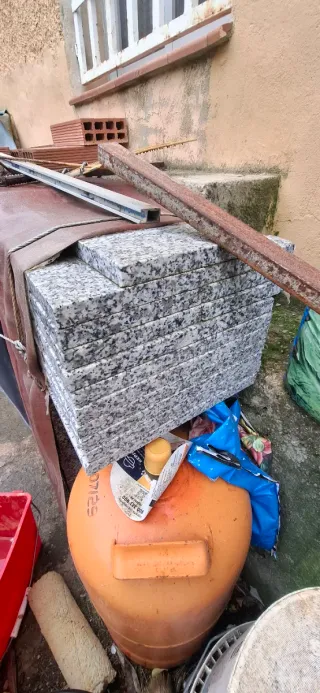 Se venden peldaños de granito, ideales para construir o renovar una escalera. El material es resistente y duradero. Nunca se ha colocado , hay 90 piezas de 32x60cm , peldaños y toda lo que iba en la terracita - Granito con veteado gris y negro. - Acabado pulido.