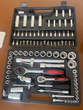 Vendo juego de herramientas Kraftmann de 94 piezas. Está en perfecto estado y completo. - Incluye llaves de vaso, carraca, vasos, adaptadores y mucho más. - Ideal para mecánica y bricolaje. - Maletín de transporte incluido.