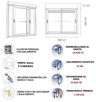 Ventana de PVC corredera, 🪟color blanca y medidas 100x118cm. Perfil de 84mm tiene 5 cámaras aislantes, con doble acristalamiento 4/16/4 bajo emisivo y gas argón, que favorece el ahorro energético. Refuerzo interior perimetral: tanto en hojas como marco de acero galvanizado, lo que ofrece mayor durabilidad al producto, además de mayor resistencia ante posibles dilataciones de la fachada. PRODUCTO NUEVO EN SU EMBALAJE ORIGINAL