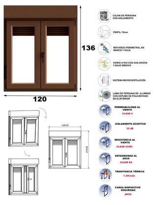 Ventana de PVC en color roble con persiana de aluminio con poliuretano, con apertura oscilobatiente (que es la más hermética y segura y te permite ventilar la estancia sin tener que abrir por completo la hoja derecha). La ventana lleva un perfil de PVC de 70 mm de espesor (que aporta un alto aislamiento) y cuenta con 6 cámaras en marco. Refuerzo de acero perimetral en marco y hojas. Doble acristalamiento de 24 mm 4i/16Ar/4 con tratamiento bajo emisivo y gas argón. PRODUCTO NUEVO EN SU EMBALAJE ORIGINAL