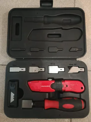 Vendo kit de corte profesional Wahlen, ideal para trabajos de precisión en construcción, reformas, instalación de suelos, moqueta, PVC o retirada de juntas y silicona. ✅ Incluye maletín original ✅ Mango profesional ergonómico ✅ Varias cuchillas intercambiables (12 mm, 16 mm, 20 mm y 16 mm 65°) ✅ Herramienta para cambio de cuchillas ✅ Estado muy bueno / poco uso Herramienta robusta y práctica para profesionales o bricolaje exigente. Todo organizado en su maletín rígido original. 📦 Se entrega tal y como aparece en las fotos. 📍 Entrega en mano o envío por Wallapop.