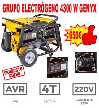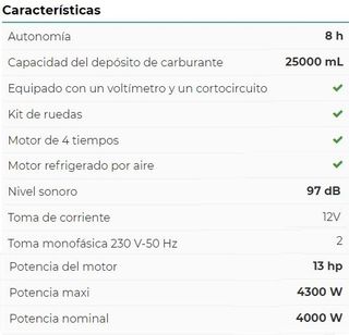 Potencia nominal 4000 W *Potencia máxima 4300 W *Motor 4 tiempos: gasolina. *Autonomía: 8 h Consigue conectar los principales aparatos de tu hogar sin recurrir a la red eléctrica. Muy recomendado en caso de cortes eléctricos o de acceso limitado a la red. Uso variado: como conectar herramientas eléctricas, sistema de iluminación, camping, entre otros. BENEFICIOS *Sistema AVR *Depósito 15 L *Ruedas y estructura resistentes para trasladar más fácilmente. PRODUCTO NUEVO EN SU EMBALAJE ORIGINAL