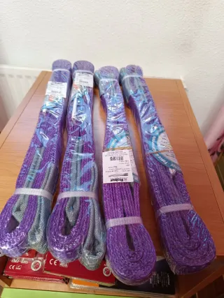 Lote de cuatro eslingas de elevación de la marca Robur. Son de color morado y gris. - Capacidad de carga: 2000 kg. - Longitud: 3 metros. - Material: Poliéster. - Cumplen normativa EN 1492-1.