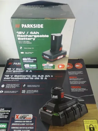 Se venden 2 baterías recargables Parkside de 12V - 1 baterías Parkside 12v 4Ah - 1 batería Parkside 12v 2,5Ah - 1 cargador rápido Parkside 12v 6.0A performance - Tecnología Li-Ion. - Compatibles con la serie 12V TEAM.
