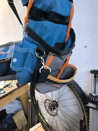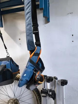 Riñonera de tela para llevar herramientas. Es de color azul y naranja. - Múltiples compartimentos. - Cierre con clip y anilla.