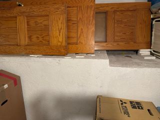 Se venden puertas de madera de pino. En la foto están todas las que hay,medidas y mano. La del cristal está roto de tenerla almacenada Precio por unidad - Material: Madera de pino. - Diseño con paneles.