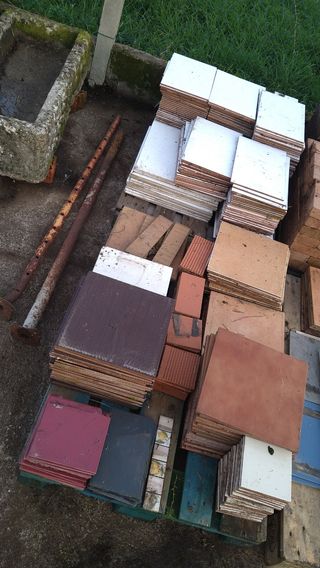 Al que le interese algo que venga a verlo y tratamos en persona con el material delante. Se vende, NO REGALO. plaqueta, baldosa, azulejos, piedra serrada para ventanas y puertas, losas, marmol, granito, piedra pulida, hay material nuevo y usado. Azulejo blanco de distintas medidas. Plaqueta pizarra para duchas, plaqueta marmol para hall. Piedra para forrar paredes. Precios segun material y cantidad. Plaquetas tipo pizarra vendidas, tejas vendidas. Reparaciones, obras, suelos, paredes