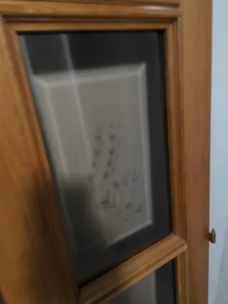 Puerta de salón de madera con detalles de cristal. - Diseño clásico con paneles de madera. - Cristales translúcidos para privacidad. - Tirador metálico dorado.