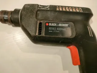 Vendo taladro eléctrico Black & Decker modelo BD562 original (Made in England). Un clásico que nunca falla, ideal para bricolaje en casa, montar muebles o pequeñas reparaciones. Características técnicas: Potencia: 400W. Capacidad: Portabrocas de 10mm. Velocidad: 2100 - 2500 RPM. Estado: Funciona perfectamente. Tiene marcas estéticas de uso normal (ver fotos), pero el motor suena sólido y tiene mucha fuerza.