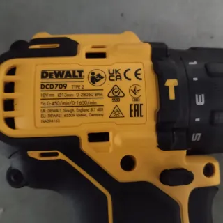 Taladro percutor DeWalt DCD709. - Voltaje: 18V - Diámetro del portabrocas: 13mm - Velocidad sin carga: 0-28050 RPM - Velocidad de giro: 0-450/min / 0-1650/min - Fabricado en Reino Unido y Alemania.