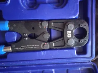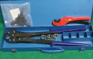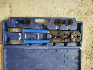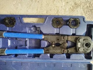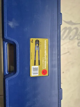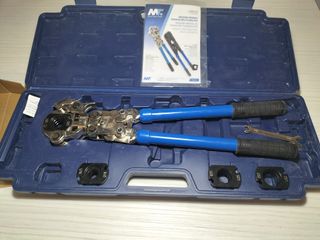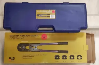 Herramienta de prensa manual para instalaciones de tuberías. Viene en su maletín original. - Incluye juego de mordazas. - Maletín de transporte azul.
