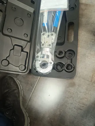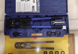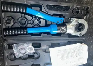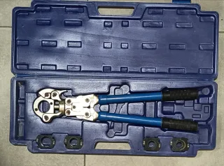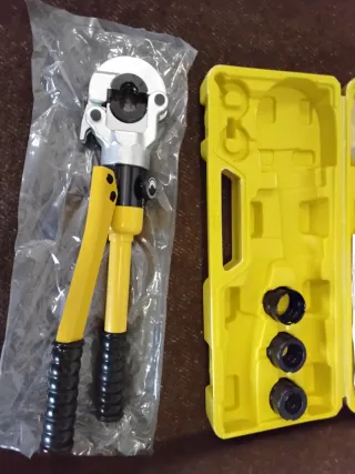 Herramienta de prensado hidráulico para instalaciones y tuberías. Incluye un juego completo de accesorios y manual de instrucciones. - Incluye juego de troqueles para diferentes tamaños. - Mango ergonómico para un agarre cómodo. - Estuche resistente para transporte y almacenamiento.