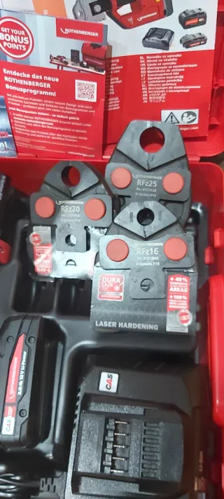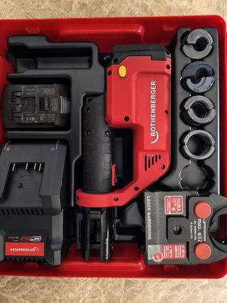 Prensa multicapa Rothenberger en su maletín original. SIN USAR, NUEVA COMPLETAMENTE Mordaza con casquillos intercambiables TIPO U MEDIDAS: 16,20,25,32 Batería 2.0ah Cargador - Incluye accesorios y manuales. Se ruega seriedad, trato en mano, abstenerse ofertas absurdas