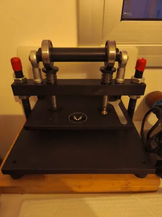 Prensa manual para cortar cuero. Ideal para trabajos de marroquinería y artesanía. - Construcción robusta en metal negro. - Rodillo superior con rodamientos. - Muelles para ajuste de presión.