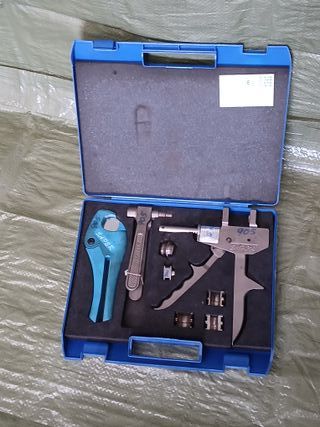 Herramienta manual para prensar tuberías multicapa. Incluye juego de mordazas y maletín. - Cabezal giratorio 360°. - Mango ergonómico. - Maletín de transporte rojo. Totalmente Nuevo!!! Entrega en mano o envíos seguros por wallapop.